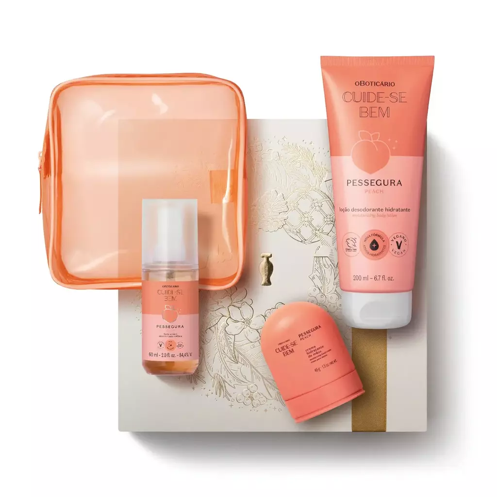 O Kit Presente Natal Cuide-Se Bem Pessegura traz a suavidade do Pêssego para a rotina da sua pessoa especial. Cada item deixa sua rotina de skincare mais completa, com itens que vão intensificar a hidratação e a perfumação, além de uma charmosa e prática nécessaire. Essa ideia de lembrancinha de natal vem com quatro itens com a fragrância queridinha, embalados em uma caixa especial: